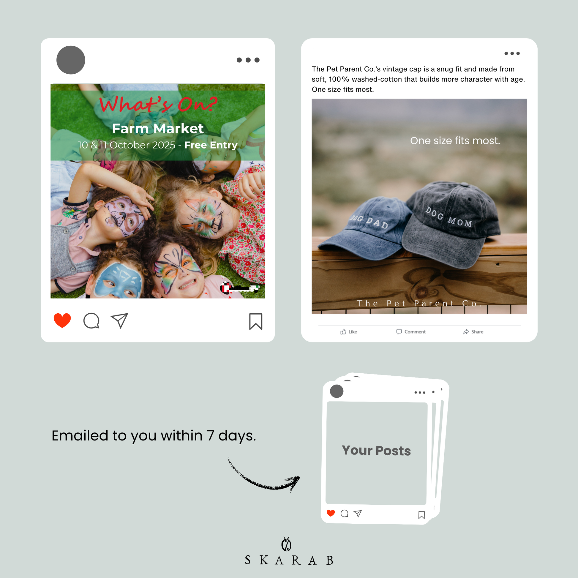 If you’re new, you’ll need to invite us to your Meta Business Suite before your chosen date. It’s easy, see how here: https://skarab.co/pages/how-to-invite-skarab-to-your-facebook-instagram-pages